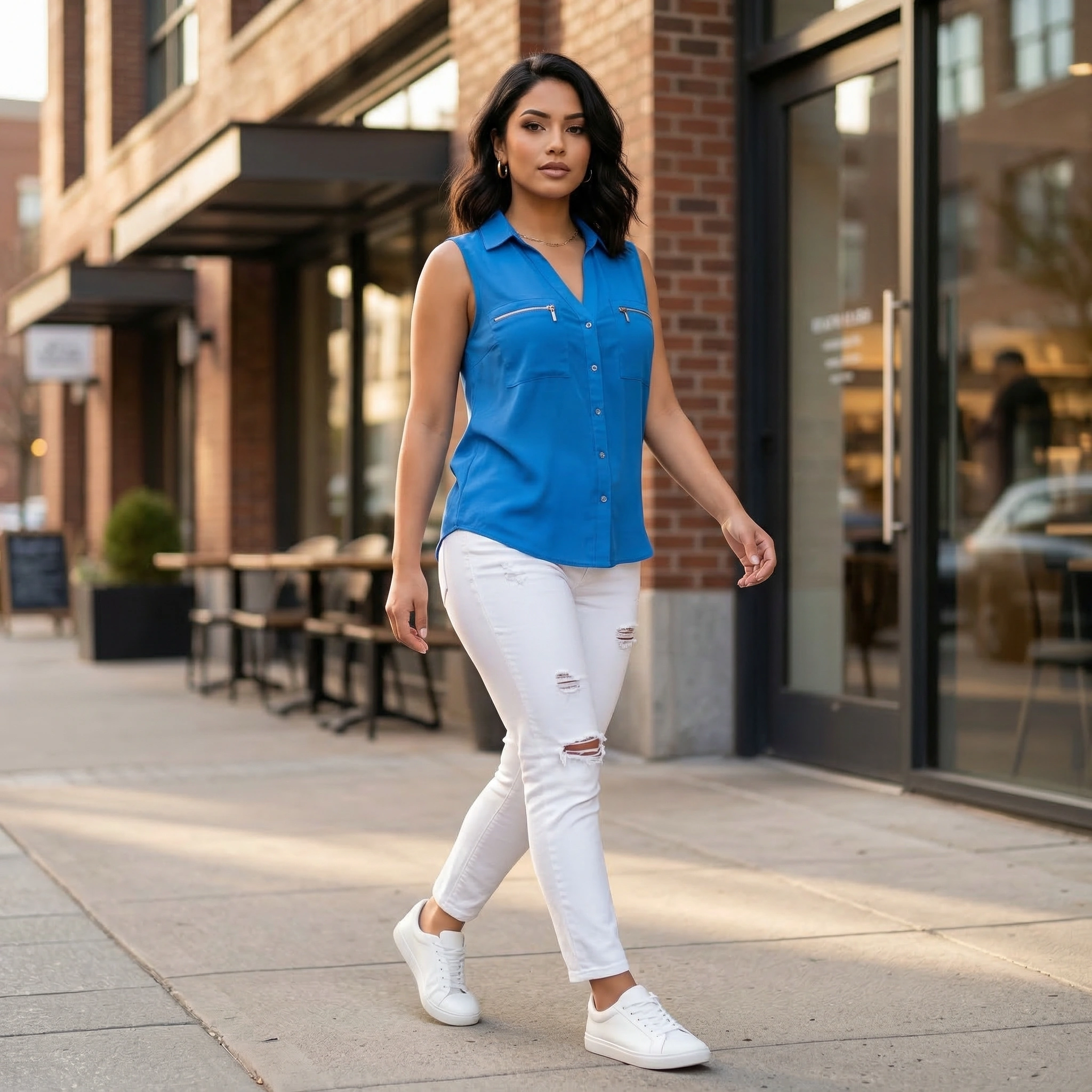 Blue Crush Sleeveless Button-Up Top with dual zippered chest pockets