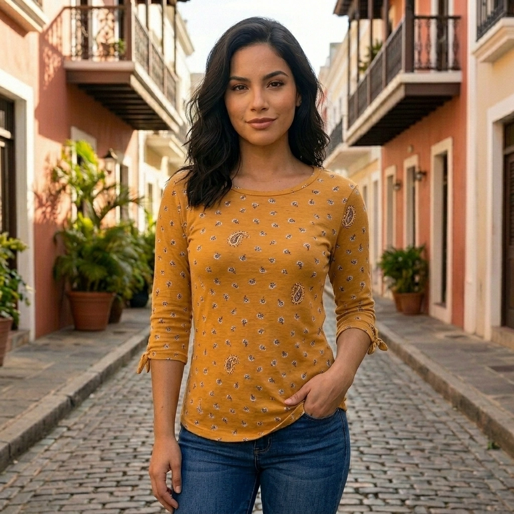 Soft, stretchy fabric with a body-hugging fit and boho-inspired paisley print. Cute tie details at the sleeves add a flirty touch to this everyday essential.