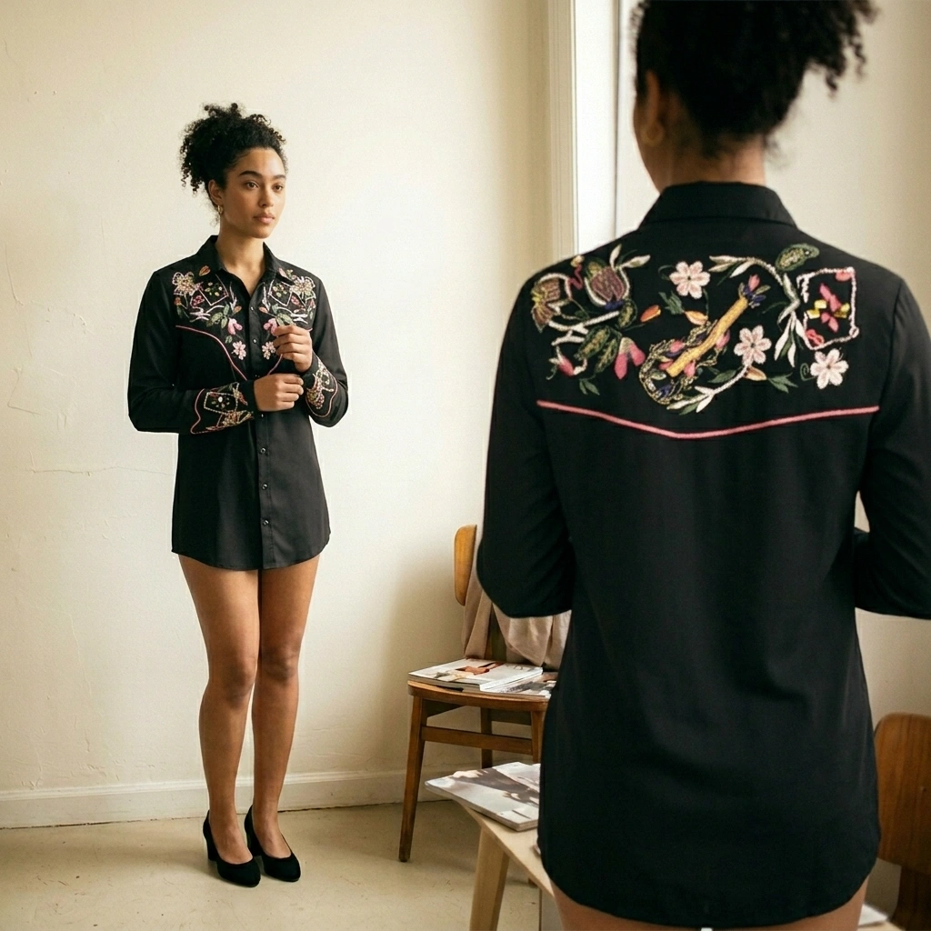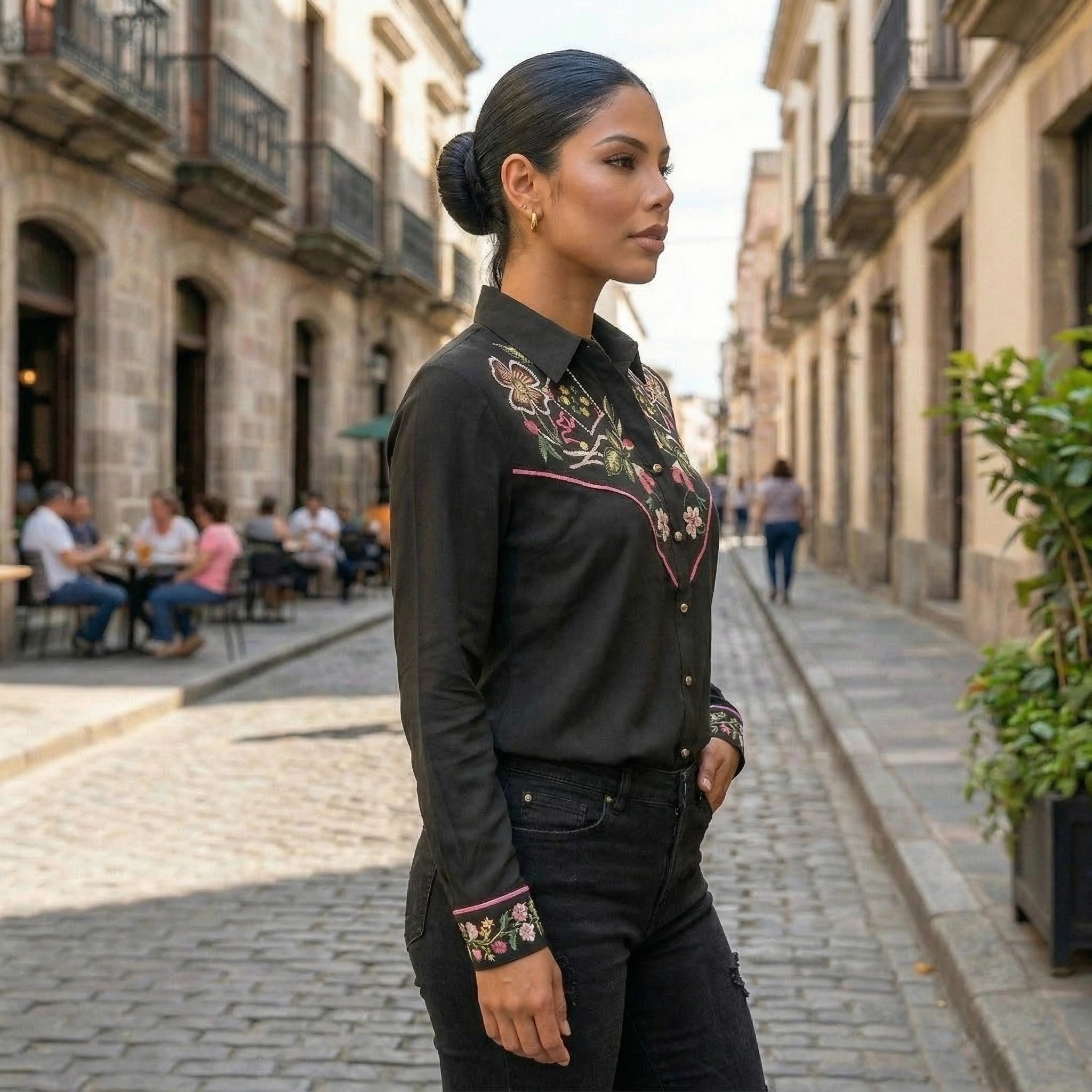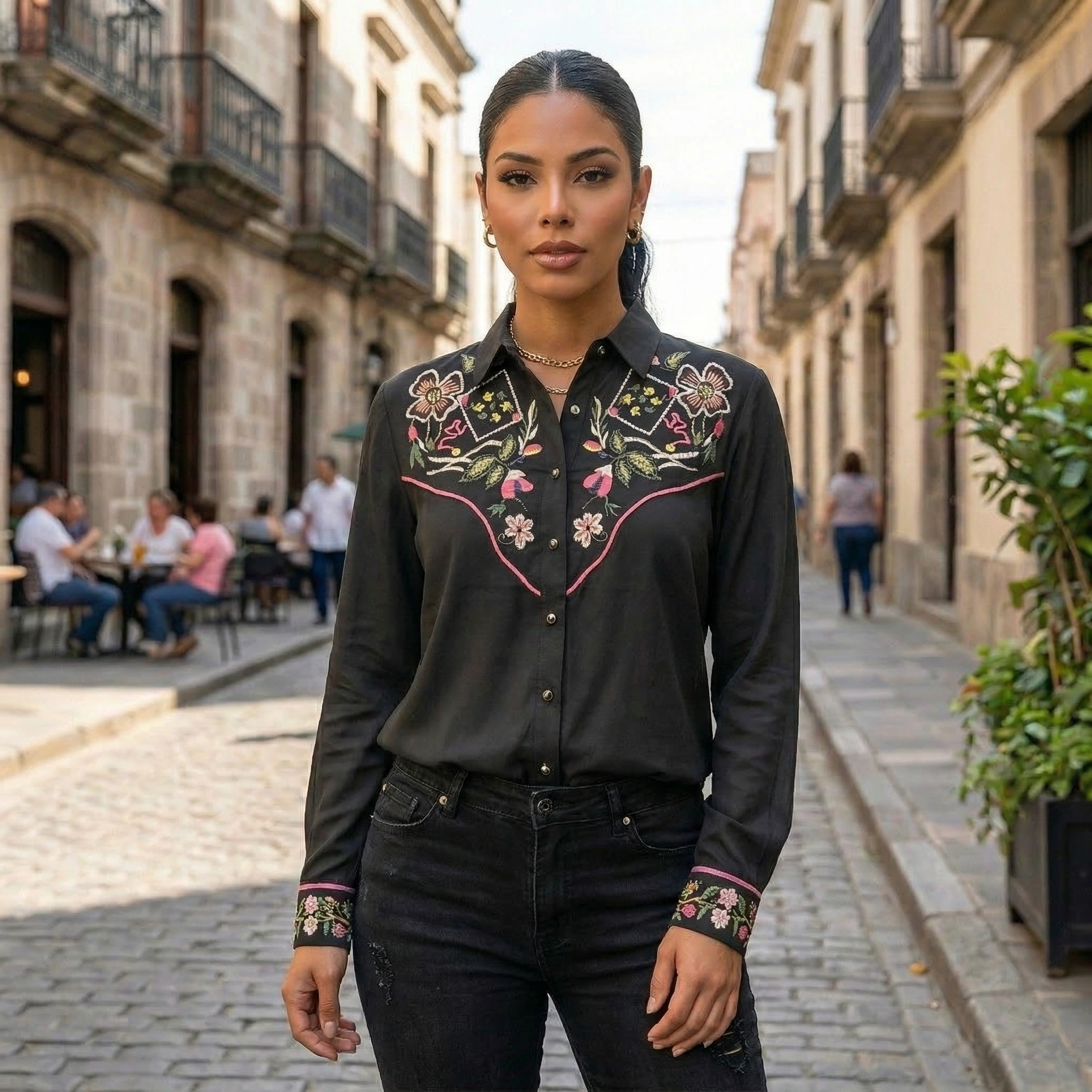 Crisp white fabric with delicate floral lace sleeves and romantic ruffle details. Tailored fit with a high collar gives you that elegant, sophisticated vintage vibe.