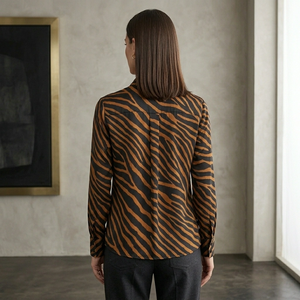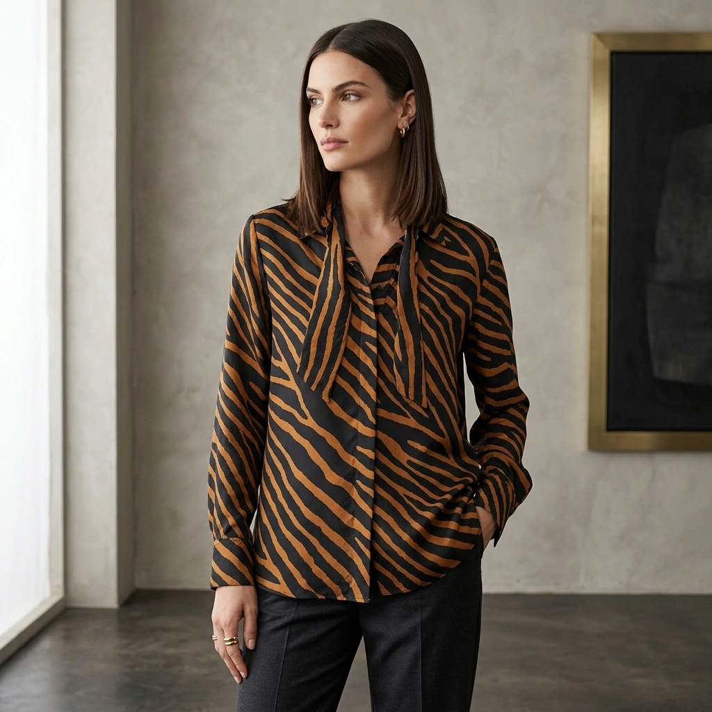 Smooth, flowing fabric with bold tiger stripes and a chic tie-neck collar detail. Relaxed fit gives you that effortlessly cool, statement-making vibe perfect for standing out.