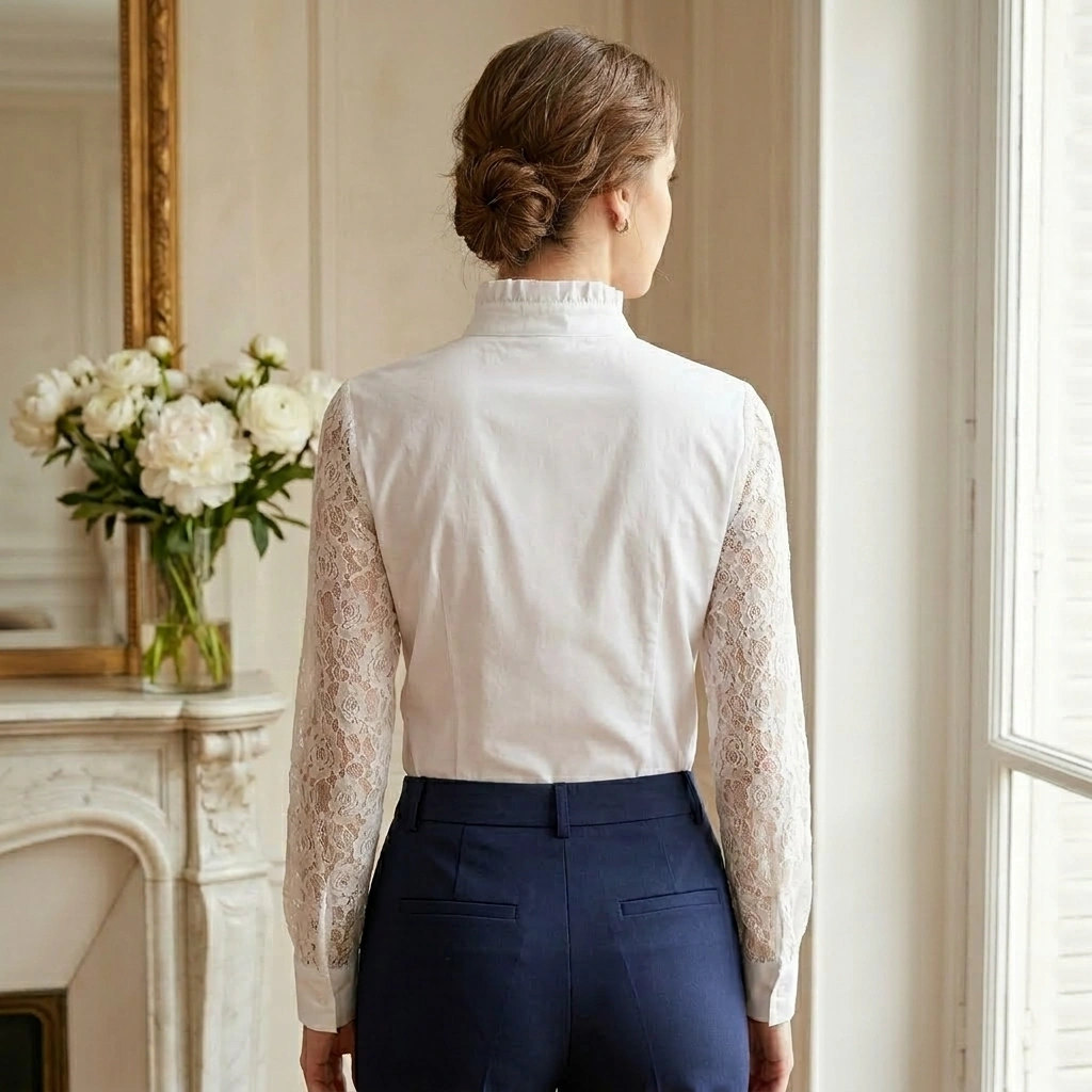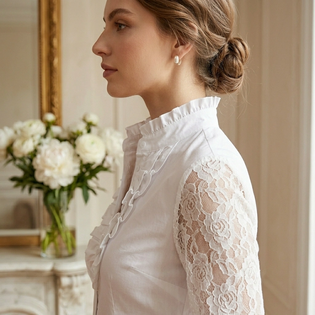 : Crisp white fabric with delicate floral lace sleeves and romantic ruffle details. Tailored fit with a high collar gives you that elegant, sophisticated vintage vibe.